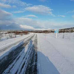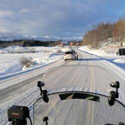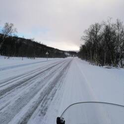 Durch herrliche Winterlandschaften und schneebedeckte Straßen ging es erst nach Alta. Auf dem Weg sind wir auf die Blümchenpflücker gestoßen, die wir schnell hinter uns ließen. Hier gab es an einigen Stellen die berühmten geradeaus Passagen. Im Sommer bestimmt langweilig, hier und heute ein Genuss.