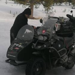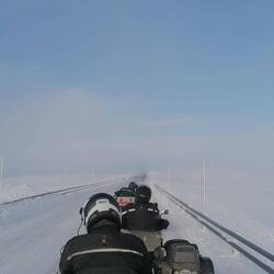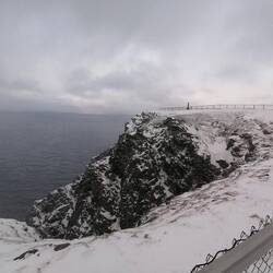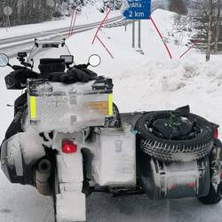 Andreas, Werner, Max, ich, hinter den anderen her. Wollten nicht die ganze Strecke Kolonne fahren. Straßen waren fahrbar bis oben hin. Nicht immer frei, aber immer sauglatt. Die Sicht war nicht immer optimal, viel grau und weiß in weiß. Man musste schon höllisch aufpassen. So hat es mich dann auch mal (wieder) erwischt. Plötzlich war die Straße rechts 😉 von mir und ich im Graben. Nix passiert, war auch nicht mehr schnell. Viel Schnee hat das Gespann sanft zum Stehen gebracht. Zu dritt bekamen wir es auch leicht wieder auf die Straße. Etwas später, hinter dem Magerøya Tunnel, trafen wir die anderen am Wanderparkplatz. Von hier aus im Gänsemarsch weiter. In Honningsvåg erwische es den Chef. Beim Abbiegen Orientierung verloren und zack im Tiefschnee ab Fahrbahnrand. Auch kein Problem, nix passiert. Abschleppseil dran und rausgezogen, weiter.
