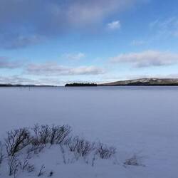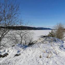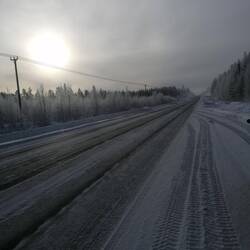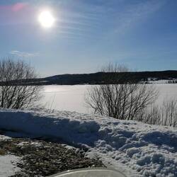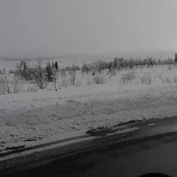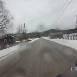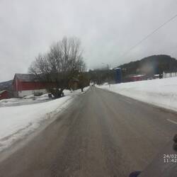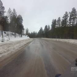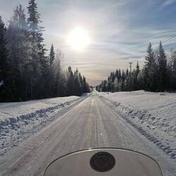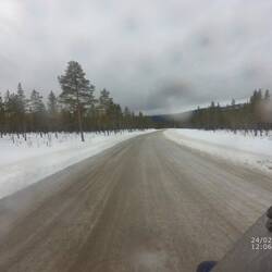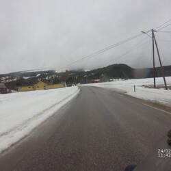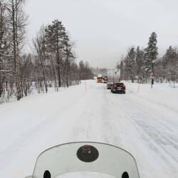 Nach der Fähre zurück zur E6. Langsame Fahrt, weil ständig auf 50 oder 60km/h beschränkt. Vor mir der Golf machte die Pace. Im Team hab ich dann den Abzweig zu 87 verpasst. 🙄🫣. Die 87 war mal wieder eine Straße nach unserem Geschmack. Schön verschneit, kurviger auf und ab.
