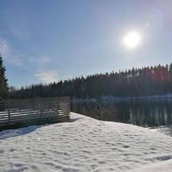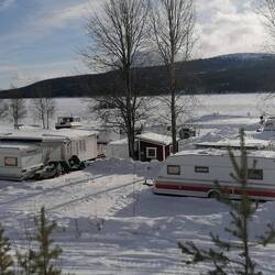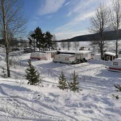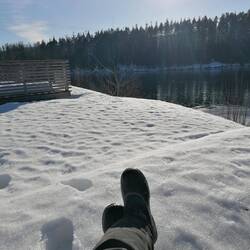 Heute mal Übernachtung in Hütte auf Campingplatz. Der ganze Platz mit Pulverschnee bedeckt. Drunter Zentimeter dickes Eis. Wunderschöne Idylle.
