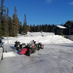 Heute ist der Tag der Snowmobiltour. Wir wollten uns das Sdoekrakel mal anschauen und sind deshalb zum Idrefjell gefahren. Die Vorbereitungen dauerten aber so lang, dass wir nicht warten wollten. Haben dann die geplante Runde zum Grövelsjon und nach Femunden weiter und zu Ende gefahren. Es war teilweise heftig warm. Am Grövelsjon waren es +10°.