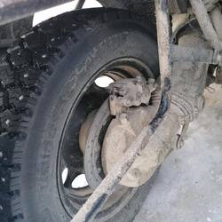 Die Nacht war kühl. Auf dem Thermometer vorm Haus waren um 07:30 Uhr noch deutliche Minusgrade. Hab mich dann direkt an die Bremse gegeben. Alles total vermockt mit einer tiefgefrorenen Kruste aus Salz und Staub aus durchgefahrenem Split. Mit dem Hammer musste ich das Zeug abkklopfen. Der Bremsbelag hinten war vollkommen runter. Blankes Metall.