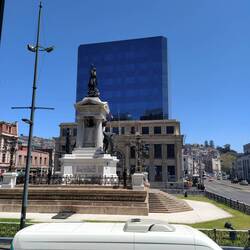 Präsidentenpalast La Moneda mit Denkmal für Salvador Allende und die Kathedrale. Ein spanischer Eroberer mit Taube auf dem Kopf 😁