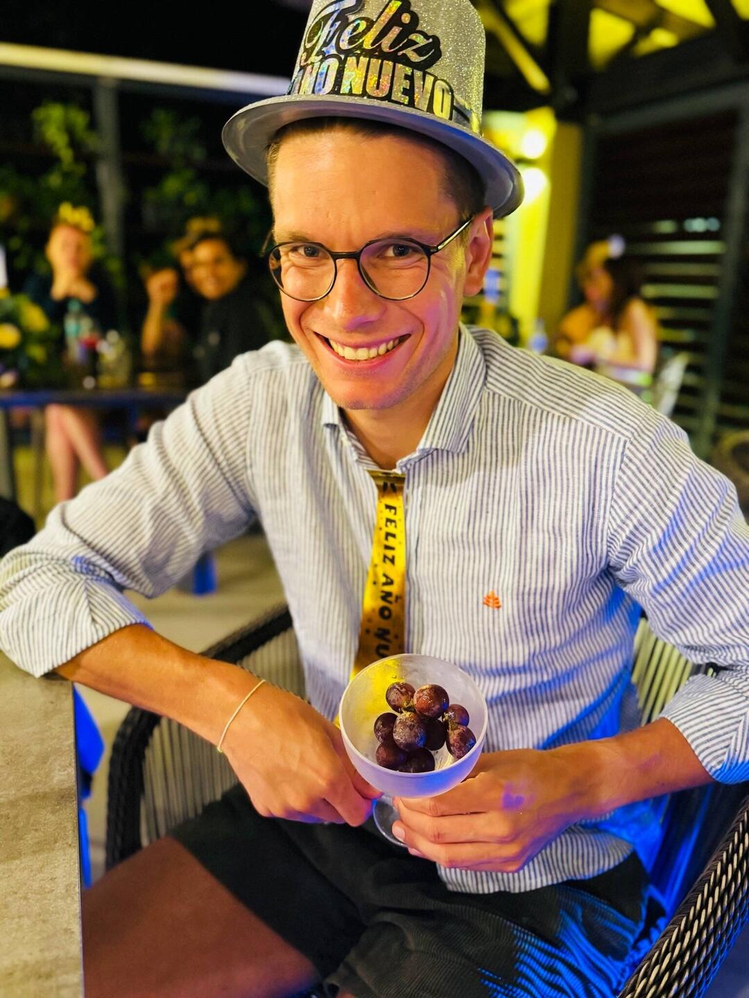 Es gab 12 Weintrauben🍇, wobei jede einzelne für einen Monat des nächstes Jahres steht. Man darf sich für jeden Monat etwas wünschen, sofern die Traube süß schmeckt wird es ein guter Monat und sofern sie etwas bitter ist, wird der Wunsch etwas härter zu erreichen.