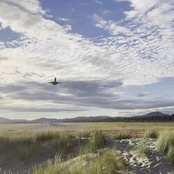 Zum Ende des Tages geht’s zum Seven Mile Beach, am Ende der Flughafenstartbahn Hobarts. Ein toller Ort, um die aufsteigenden Flieger zu beobachten. Nun ist Hobart kein stark frequentierter Airport, dennoch kriegen wir‘s hin zu rechten Zeit vor Ort zu sein. Die Boeing fliegt zum greifen nah direkt über uns.