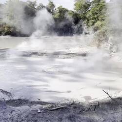 Die Stadt Rotorua befindet sich in einer Caldera, die vor etwa 240.000 Jahren bei einem großen Vulkanausbruch entstanden ist. Diese Caldera ist die Quelle der geothermischen Aktivitäten. Wir spüren hier den allgegenwärtigen Geruch von Schwefel, denn an vielen Stellen tritt heißer Dampf mit Schwefelgeruch aus Tümpeln und Erdspalten hervor.