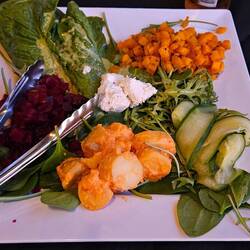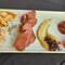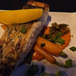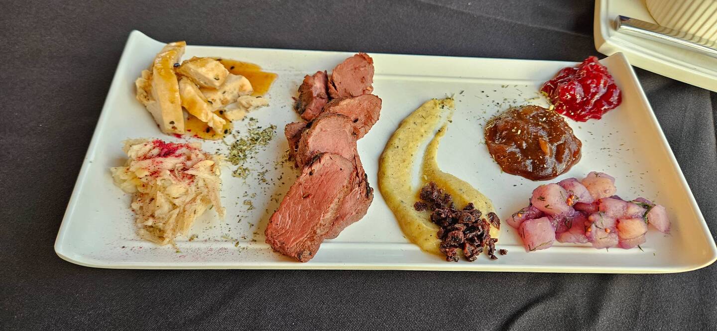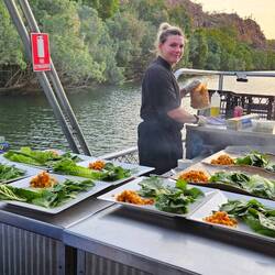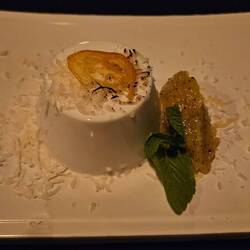 APERO....Unten links Krokodil, oben poulet und in der Mitte Känguruh... HAUPTSPEISE... Paramundi DESSERT... Pannacotta.