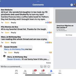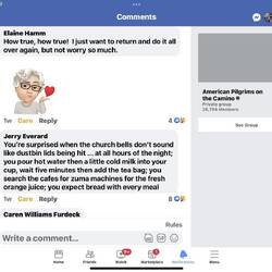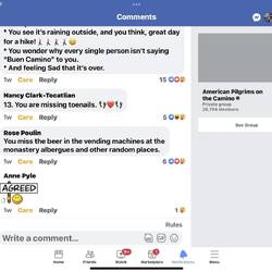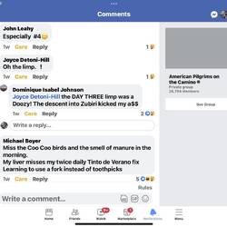 Camino De SantiagoThe World is Out ThereAfficher le voyageAjouter à ma liste de choses à faireSupprimer de ma liste de choses à fairePartagerJour 50jeudi 7 juillet 2022 à 06:10 ⛅ 57 °F Altitude: 262 p États UnisMohlendorph Creek47.718372, -122.37281747°43’6” N 122°22’22” WSigns of Camino Withdrawl 7 juillet 2022, États Unis ⋅ ⛅ 57 °F Facebook post to American Pilgrims on the Camino. Voir la traduction0 j’aime Afficher le voyage