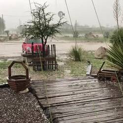 Within seconds all hell broke loose, rain, then hailstones the size of large marbles started pelting down. I went out on to the verandah to photo & video the spectacle. Lola appeared & ran through the developing lake outside & across to the barn opposite where the door had been torn open. Kelly then appeared & started to run to help her, but he tripped & fell head first into a stony puddle with a loud thud. It looked & sounded painful, but he got up & ran on, probably a bit embarrassed.