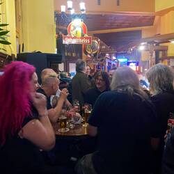 As we were leaving, talk spread of where everyone was going for a post gig drink. It was at a bar virtually next door. Upon entering it was really strange to discover that people were actually smoking at the bar and it was quite a smoky atmosphere. Priscilla, Lex, Ramon and I sat at a table next to a table with a few of our Magic Bus NMA stalwarts, Red, Stu and Jo. It was not long before I noticed that Dean White and Michael Dean were now talking to Red, Stu and Jo. Nu the new keyboard player and the female roadie were also in the bar.