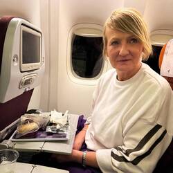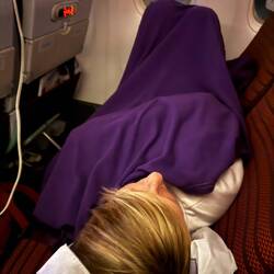 After a couple of hours of sleep, I woke up with Jackie still using my thigh as a pillow. I tried to surreptitiously get up to go to the toilet and in the process accidentally dropped my iPad on Jackie’s head. She didn’t make a fuss………much. A glass of red wine to soothe the pain seemed to do the trick!
