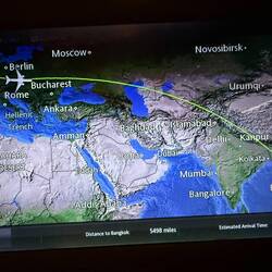 The Thai Airways flight to Bangkok departed on time (around 9.35pm) and much to our happy surprise it was just about a third full. After dinner and a couple of drinks, Jackie stretched out and fell asleep using my thigh as a pillow.