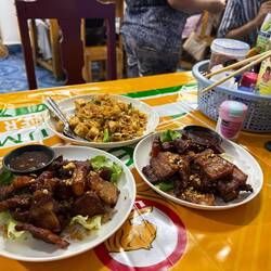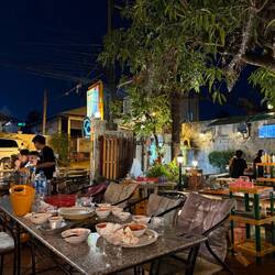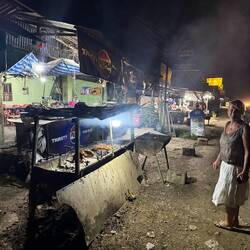 We found a BBQ/Grill place just 200 metres away that seemed quite lively (it was the last night of Chinese New Year). We sat down and order 2 large BeerLao. The young waiter then just stood there smiling as we leafed through the menu book, despite several attempts by us to encourage him to get our beers. Jackie also tried to enquire whether we could pay in either Thai Baht or US dollars, but this just prompted more grins from the waiter.