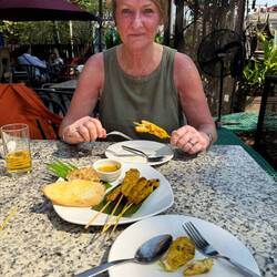 20 minutes later we were done and we walked back to Khop Chai Deu for a couple of large BeerLaos, satay chicken, garlic bread and finally a half litre of white wine, which was just about drinkable.