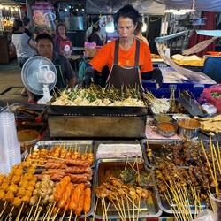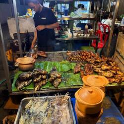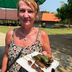 We enquired about the contents of a banana leaf package, which we assumed was sticky rice. The lady didn’t speak English, so she opened a package and showed us the contents. It didn’t look appetising, but we agreed to buy it as she had taken the trouble to open it for us. We inexplicably also ordered a couple of sticks of burnt pork bites, which we definitely didn’t need.