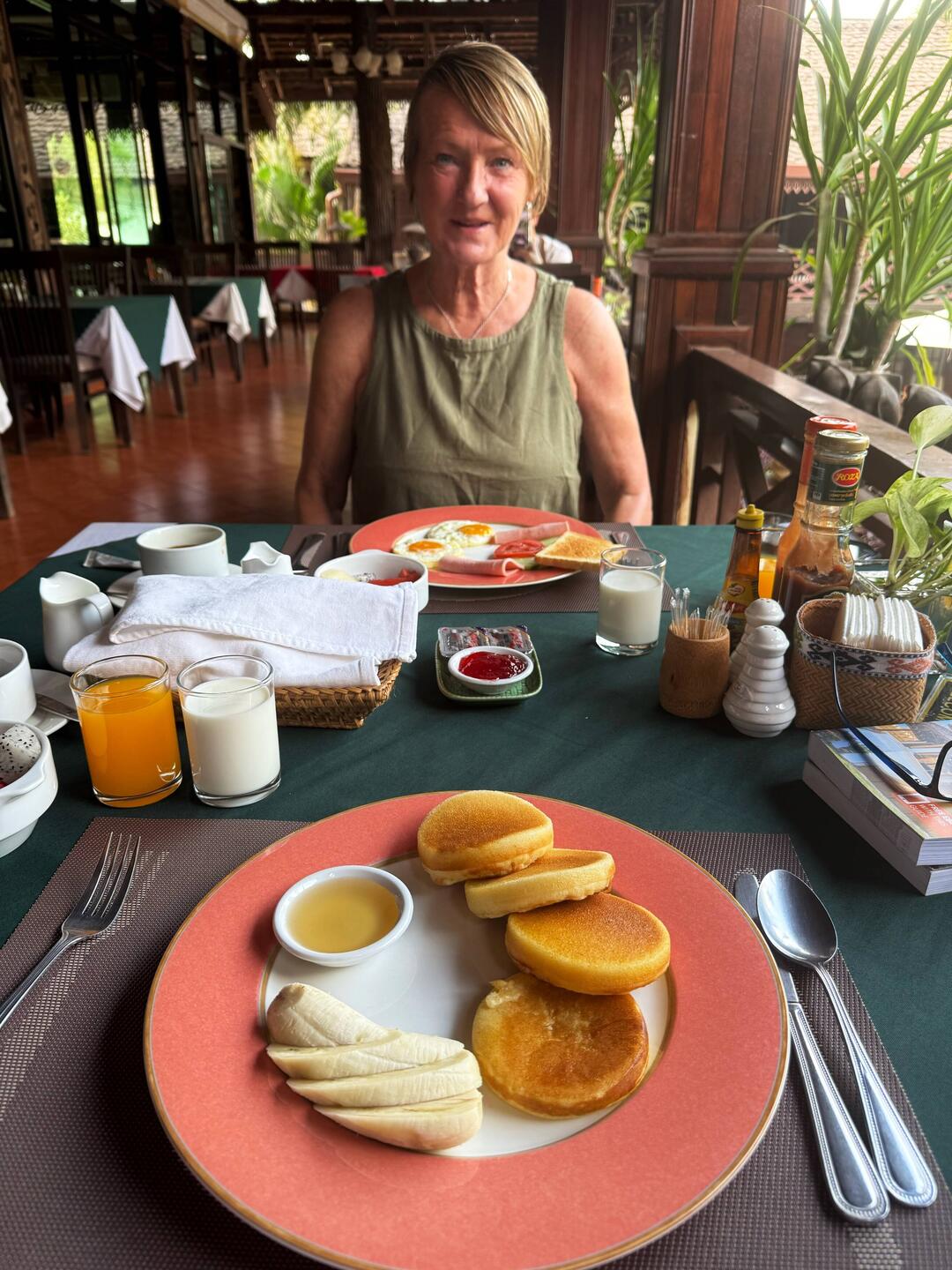 We both finally had a decent nights sleep. I woke up at 6.30am and Jackie managed to sleep on to 8.30am. We went down to breakfast 45 minutes later. I ordered the pancakes with banana and honey, whilst Jackie went native and ordered fried chicken rice with a fried egg on top. Our best breakfast so far.