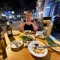 We stopped for another beer and a plate of delicious healthy fresh spring rolls with pork, before walking them off walking back to our hotel via the Old Bridge. It was 4pm when we arrived back in our hotel room with my phone showing that we had walked 5.5 miles. We had a well earned lie down in the air conditioning.