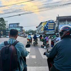 Suitably refreshed, we were back on the bike and racing towards Vientiane. The road was much busier with rush hour traffic. Once we actually arrived back in Vientiane there were vehicles everywhere and the rules of the road went out the window.