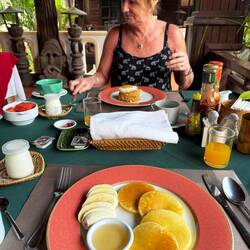 Around 9am we went down for breakfast and were presented with a tickbox order form to complete for the waiter. Jackie selected the American breakfast of fried eggs & ham, whilst I chose the Continental breakfast of pancakes and honey both with everything on offer. We also had muesli (which was disgusting), fruit, yoghurt, a loaf of toast, orange juice and coffees. It was a very pleasant affair and we now know what to and not order tomorrow.
