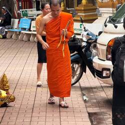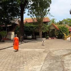 Whilst Jackie was changing, I set off to take some temple photos until a pair of nasty looking dogs ran at me barking and snarling. A young Buddhist monk in his orange outfit came to my rescue and called them off.