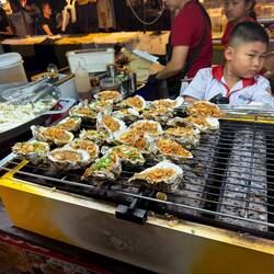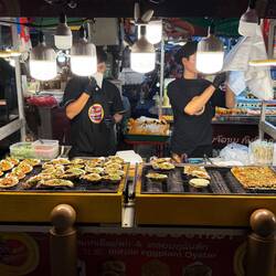 We remembered a Japanese Style BBQ restaurant on the riverside road from the previous evening so we decided to give that a try. Our circuitous route took us along the main roads, accidentally past the airport and back down to the riverside road. It was on this leg that we came to a relatively unlit area and then, and only then, did I realise that we had been riding around the entire night without any lights on. That explained a few things. Luckily we hadn’t got stopped by the police, otherwise we would have been looking at a double fine with Jackie still refusing to wear her helmet.
