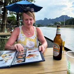 The shuttle bus dropped us off at the Old Post Office and we walked down to the Mekong River, where the riverside was lined with tons of inviting waterfront restaurants - too many to choose from. We strolled up and down umming and aahing and eventually settled on an Indian and Malaysian restaurant. We sat down and opened the menu, but to Jackie’s utter horror they didn’t sell alcohol - it was a Muslim restaurant. We made our apologies and left, but vowed to go back another night.