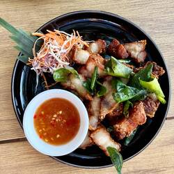 Jackie took a bite out of the contents of the banana leaf, declared it vile, then immediately consigned it to the bin. The pork bites were fatty and overcooked. This was not a success. I ordered a banana pancake, which was delicious.