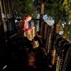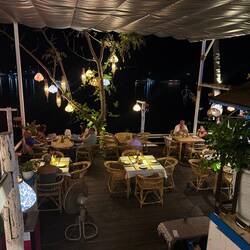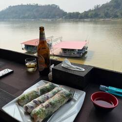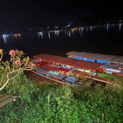 I returned to the room where Jackie was still doing her hair and makeup. We had a whisky and coke on the balcony then Nou booked us a 24,000 Kip Kok Kok Move (KKM) to the river front. We selected a table at a riverside restaurant overlooking the Mekong and the lights of Thailand beyond.