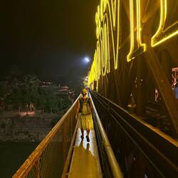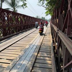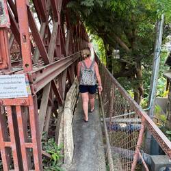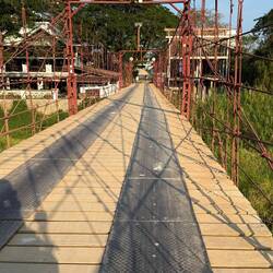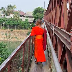 We walked out of the hotel to find a cold beer and a spot of lunch. After a couple of quick right hand turns, we crossed the ‘Old Bridge’ high above the Nam Khan. The Old Bridge is for motorcycles and pedestrians only. The pedestrian footpaths were either side of the busy motorcycle carriageways on a metal sheet floor. Some of the metal sheets had bowed in the middle and made a hell of a racket when we stepped on the them.