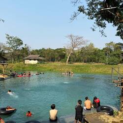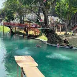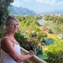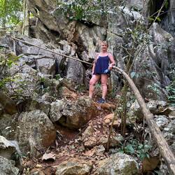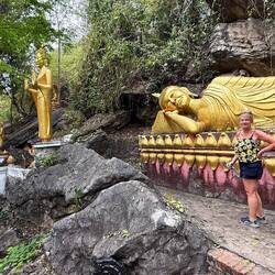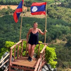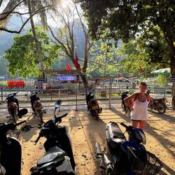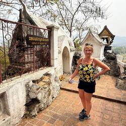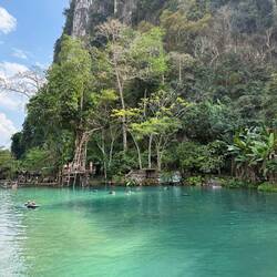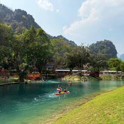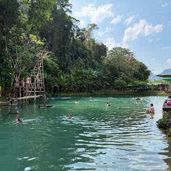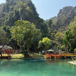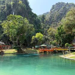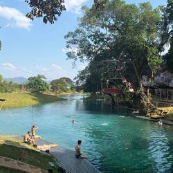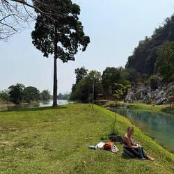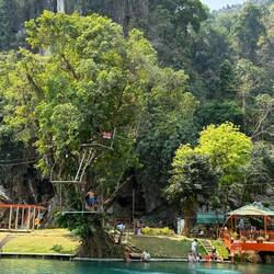 Eventually we arrived at Tham Chang, not for the cave, but so we could have a leisurely sunbathing afternoon around the lagoon and Jackie could fulfil her promise of zip lining here.