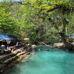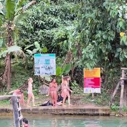 We set out our sarongs on a grassy bank overlooking the lagoon with a great view of the jump platform and zip line, then refreshed ourselves with a cold beer. We watched a couple of very young kids who worked at the lagoon go down the zip line time and time again whilst hanging upside down like a couple of little Mowglis.