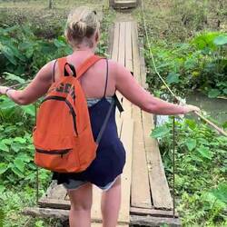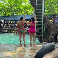 Jackie thought it was too quiet to go on the zip line, so instead we sidled into the lagoon for a little swim. Once we got out, I decided to take the bull by the horns and show Jackie how it was done.