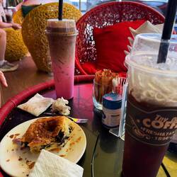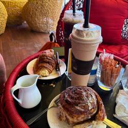There was no sign of Jackie’s coffee 10 minutes after mine had arrived. She was convinced they had forgotten, but then her pink and brown two-tone coffee arrived. It was a sickly sweet strawberry milkshake flavoured coffee and nothing like yesterday’s coffee.