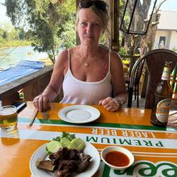 After an hour or so we were melting and it was a pleasure to be back on the bike with a breeze - in Jackie’s case rushing through her hair. Several miles back along the road towards Vientiane, we pulled over at a scenic little riverside shack, where we treated ourselves to our couple of beers and a nest of very crispy fried noodles to snack on.