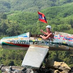 It was 2pm, when we stopped at Khop Chai Deu, which translates as Thank You in Lao, bar and restaurant. It was clearly a popular westerner’s hangout, particularly with Aussies. Not our usual choice of lunch venue, but it provided welcome shaded relief from the 34 degree midday sun. We necked a total of 3 large BeerLaos and a plate of chicken satay, which was very pleasant.