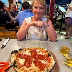 There was no queue when we arrived and we were allocated a small table for four. We ordered 2 beers and a pizza with mozzarella, garlic and spicy salami. It was supposed to be a non spicy meal, because we were travelling in the morning, but Jackie ordered additional toppings of onions and fresh chillies for our shared pizza. The pizza was lovely and tongue tingling, so we ordered a carafe of white wine to help numb the pain.