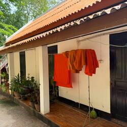 After lunch, we headed to Wat Sisaket, the oldest wat in Vientiane. We had to pay a 30,000 Kip (£1) entry fee and Jackie was made to wear a pair of trousers to enter. We entered the temple and I managed to sneak a photo. We also walked around the tile roof cloisters that contained 100s of Buddhas, then around the outside of the cloisters which were where the monks were residing. Our visit was interrupted by a group of visiting Thai dignitaries complete with their own film crew.