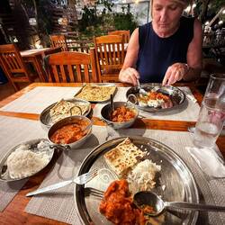 We had a few beers at a riverside bar, served by a stroppy 10 year old girl, then we walked along to Fathima’s restaurant. I ordered a chicken tikka masala and Jackie ordered the ‘spicy’ rogan josh together with steamed rice, two parathas and two bottles of sparkling water.
