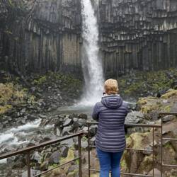 Godafoss can be read as either “waterfall of the goð (pagan idols)" or "waterfall of the goði (chieftain)." Either way it is an attractive looking waterfall where the water of the river Skjálfandafljót falls from a height of 12 metres over a width of 30 metres. We walked the 1.8-mile hiking trail loops around the waterfall area & took photos from most angles. It was again bitterly cold & I was grateful for my gloves & new woolly hat.