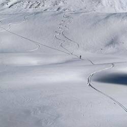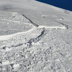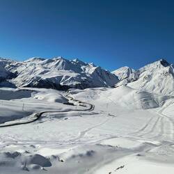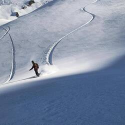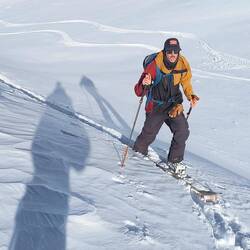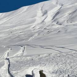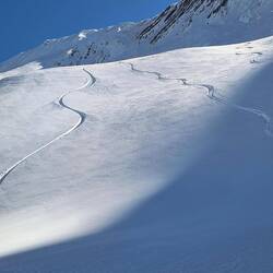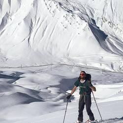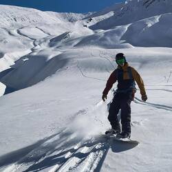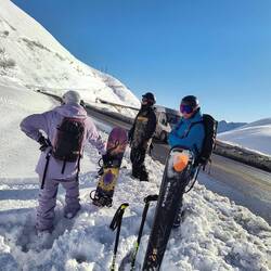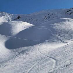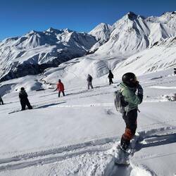 Shamus, Flatman und ich haben eine kleine skitour auf die Bidara backside geplant und sind dann auch losgezogen. Wieder bei bestem Wetter und ein paar Tage nach dem letzten Schneefall war noch ein bisschen Powder übrig. Der Hang ist Nordseitig und auf knapp 3000m also sehr brauchbarer aber auch verblasener Schnee mit vielen Steinen. Die Sharks lauern überall und die Vagabonds (von der Skischule) haben schon viele core shots... und sind jeden Tag am Reparieren. Zurück zur Skitour... Wir sind über die ersten steinigen und verblasenen Meter hinweg. Es schmerzt immer wieder, wenn man harten Bodenkontakt hat. Auch meine fetten Mindbender haben eine ausgeleierte Kante, die mit viel Kleber, Belag und Epoxy gefixt werden musste. Wir sind den Berg bis zur Hälfte abgefahren und dann noch einmal aufgestiegen... Mitten im Triebschnee umfellen ist nicht so einfach. Ich habe erstmals versucht einen Ski anzulassen und den anderen Ski abzufellen. Das hat super funktioniert und ich hatte ausreichend Zeit meine getrockneten Äpfel im Tee aufzuweichen und festzustellen, dass es hervorragend schmeckt. Der Aufstieg ging nicht ganz bis hoch auf den Sattel da wir einfach bis zu einem wunderschönen Powderhang gelaufen sind und die ersten lines fahren konnten. Parallel zu uns fuhr eine 10er Gruppe ab, die ewig brauchte um zu starten und alle Fahrer ins Tal zu kommen.. als wir unten im Tal standen, sahen wir sie immerhin auf der Hälfte. Eigentlich wollten wir zurück trampen, aber die Polizei hat vermutlich die Passstraße gesperrt, da 20 min kein einziges Auto in unsere Richtung fuhr. Auf die langsame Gruppe wartete ein Bus und mit viel Geduld kamen sie dann an der Straße an. Marc, ein russischer Skiguide hatte ich schon am Tag zuvor hier getroffen und war mit ihm im Bus zurück.. Genauso heute mit seiner 10er Gruppe Snowboarder. Zurück in Gudauri sind wir mit dem Shino Lift wieder hoch und haben leckeres Brot mit Käse und Kartoffel Füllung gegessen. Marc hat mich dann noch eingeladen eine kleine zweite Tour mit zur Bidara Shoulder machen. Die ganze Gruppe war wieder sehr langsam und passte auch nicht auf wohin Marc verschwand. In Folge fuhr der Guide einen wunderbaren unverspurten Hang herunter, wo ich ihn nach einer kleinen Suche auch entdeckt habe. Die Abfahrt war super genial, perfekter Schnee, perfekte Neigung, einfach deluxe. Marc versuchte seine Kunden anzufunken und anzurufen. Diese hatten sich jedoch auf einen anderen Rücken eingefahren sodass wir sie nur von der Ferne sehen konnten... Alles sehr gemütlich und langwierig.. schlussendlich konnte ich wieder mit ihnen im Bus für 10 GEL zurück fahren und war dankbar.Read more