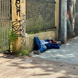 Dann habe ich genug und gehe zurück zum Hotel. Auf dem Weg sehe ich noch einen jungen Mann, welche auf einem Betonsockel an der Sonne in der Verkehrsmitte einfach schläft.