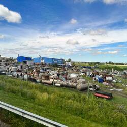 Beim Weiterfahren sehe ich vor mir Regenwolken, zuerst ist es noch gut, dann ist die Strasse teils übersät mit Kies und Sand, dazu grosse Waserlachen. In einem kleinen Städtchen hat dann ein Bächlein eine Kreuzung dick überschwemmt. Man hat die Hauptstrasse schon freigeräumt, die Nebenstrasse ist dafür gesperrt, da liegen ziemliche Haufen.