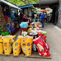 Bisher ist die Situation für Verpflegung sehr einseitig, Gemüse existiert wenig, Da sind Pizzerias,, wenig Teigwaren, viel Fleisch, immer Käse und fast kein Gemüse - wird anscheinend nur zuhause gegessen. Als Ergänzung sind überall Sandwiches zu haben, selten was Grünes drin, Tomaten sind häufig. Auch Ponchos sind gebräuchlich - eine Wurst im Brot mit Saucen nach Wunsch - an die habe ich mich wegen meines labilen Darmzustandes noch nicht herangewagt. Hamburger sind auch sehr gebräuchlich - alle Fastfood eher. Salate sind auch nicht sehr häufig im Angebot, wenn sind sie viel zu gross. Viele holen sich etwas an einem Stand und ergänzen es anscheinend zuhause. Früchte hingegen sind viel stärker verbreitet und in den Strassenläden im Angebot - Bananen, Orangen/Mandarinen, Äpfel, Pfirsiche.