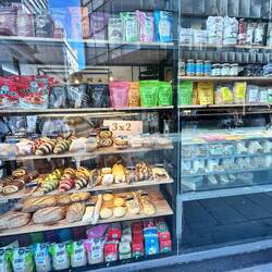 Zuerst denke ich da ist nicht viel im Shop, doch oha, frische Sachen, aber halt alles Weissbrot - wähle Gipfel mit Käse und Schinken, dazu einen grossen Milchkaffe und ein Liter Wasser.