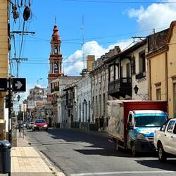 Ich mache mich auf den Fussweg zum Hotel, zur Stadt. Diverses wird natürlich fotografiert …Das Hotel ist am Hauptplatz, macht aber erst um 15 Uhr auf. Ich habe Appetit, jedoch Kaffee’s gibt es wenige. Ich gehe in eines hinein und bestelle mir einen Kaffe, dazu zwei der nicht süssen kleinen Gipfel, welche im Kaffee getunkt noch besser schmecken. Ich weiss nicht mal wie das Zeug heisst! Dann kommen immer wieder Fragen, welche ich nicht verstehe - ich soll eine Nummer angeben, das Mädchen glaubt anscheinend ich könne da was abziehen oder rückfordern. Ich erkläre kur ich sei Schweizer nicht Argentino, dann ist das mit Bezahlen auch durch, brauche nichts mehr anzugeben. Obwohl nicht viele Gäste da sind, dauert der Service. Wie ich bemerke wird hier viel gewogen, wenn Leute gewisse Sachen bestellen - meist süss. Am Morgen schonst viel Zucker.