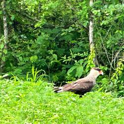 Zuerst darf ich noch Autobahn. Die Direktverbindung entpuppt sich dann jedoch als schmales, meist nicht ganz zwei Autos Breite aufweisendes Sträußchen - bei Brücken meist nur einspurig.i So zum Einfahren bin ich erst mal langsam unterwegs. Es staubt selten, das Sträußchen führt meist durch Wald, selten einmal Gegenverkehr, was aber gefährlich werden kann. Die Strassenbankette sind nicht befestigt, teils flach zur Strasse, aber gerade in exponierten Ecken gibt es uU. tiefe Rillen, wenn man ausweichen muss. Von den Seiten sind auch Erdrutsche zu erwarten, die Erde ist durchsetzt mit Steinbrocken. Zuerst ist alles schön breit. Ich kann mich ein bisschen darin üben nicht den 6. Gang einlegen zu wollen, der Wagen hat ja nur 5 - da kratzt doch mal der Rückwärtsgang … Die ersten zwei Dörfer werden breiter verschlossen, danach geht es aufs Land, nur mit Fincas, dafür mit weidenden Pferden und Kühen, die Pferde vor allem sind entlang der Strasse und müssen manchmal mit Druck dazu bewegt werden die Strasse zu räumen. Auch ein mir unbekannter Vogel macht mir die Aufwartung. Auf der Strasse sind die Kurven angezeichnet, ob es links oder rechts geht, auch Engstellen sind mit Querstreifen und Geschwindigkeitsreduktion angezeigt, denn ab und zu quert ein Bach die Strasse.