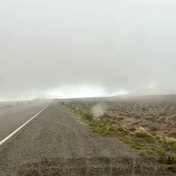 Die schweren Regenwolken hängen noch immer über mir,. Doch ich habe Glück, es macht etwas auf. Bei den querenden Bächen wäre das sonst problematisch geworden. Habe ab und zu einen Langsamfahrer, aber überholen geht gut. Trotz einiger Fotosession überholt mich keiner, erst am Schluss, da mache ich nochmals eine Foto von dem Tal - und muss mal Pee. Etwas schwierig hier an den steilen Abhängen ohne Vegetation auf um 3000 Metern. Kurze Zeit später fahre ich in eine Nebelwand hinein, 40 kmh, mehr liegt nicht drin. Da sind noch Aussichtspunkte, doch ausser sich selbst oder die nähere Umgebung und andere Reisende sieht man nichts! Nach der Passhöhe ohne Angabe wird das Wetter langsam besser, ein Nationalparkzentrum ist im Nebel undeutlich zu sehen, doch nichts regt sich da. Der Nebel schwindet nun, ich fahre tiefer und komme aus den Wolken heraus. Diese hängen an den Gipfeln als graue Decke über mir..