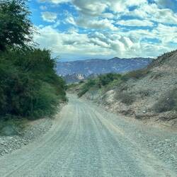 Das Wetter hat weiter aufgemacht seit der Hochebene. Nach 5 Stunden komme ich in Cachi an, schmuckes, sauberes Dörfchen, mit vielen Artesanas -Läden. Drehe eine Runde, bin aber früh in der Zeit. Esse einen Apfel und prüfe die Hotels und im nächsten Dorf auch - Molinos ist deutlich günstiger, buche da was um die 6 $ - Booking.com gibt immer noch nicht entweder den Kurs oder die Pesos-Kosten an. Kriege auch gleich eine Antwort und die Frage, wann ich komme. Cachi hat Internet/Telefon, also kann ich sagen in etwa 1,5 Stunden 47 km Schotterpiste mit Wasserlachen. Doch ich werde bald von einem Wasserlauf gestoppt, welcher die Strasse deutlich überflutet, keiner getraut sich rüber. Der Wagen vor mir kehrt dann, nachkommende drängeln ich vor, teils zweispurig auf der Strassenbreite.