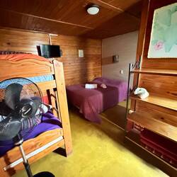 Gehe in die Dorm, sehr eng da, kein Platz für Rucksackdepot. Mein Bett hat auch keinen Stromanschluss. Vermutlich hat ma. Irgendwann noch ein Kajütenbett zusätzlich hineingestellt, so eng.