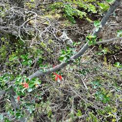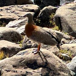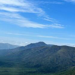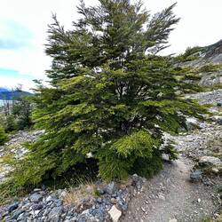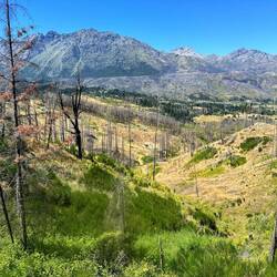 Hier ist es deutlich gebirgiger, schroffer, viele Nadelbäume, langnadelig. Wir sind nach meinem Handy-Kompass jetzt auf 850 Meter Höhe. Daneben aber immer noch die Steppe, sandig, steinig, Gras und Büsche. Hier ist anscheinend weniger Wind, die Gewächse dünken mich allesamt höher wachsend als in Patagonien.
